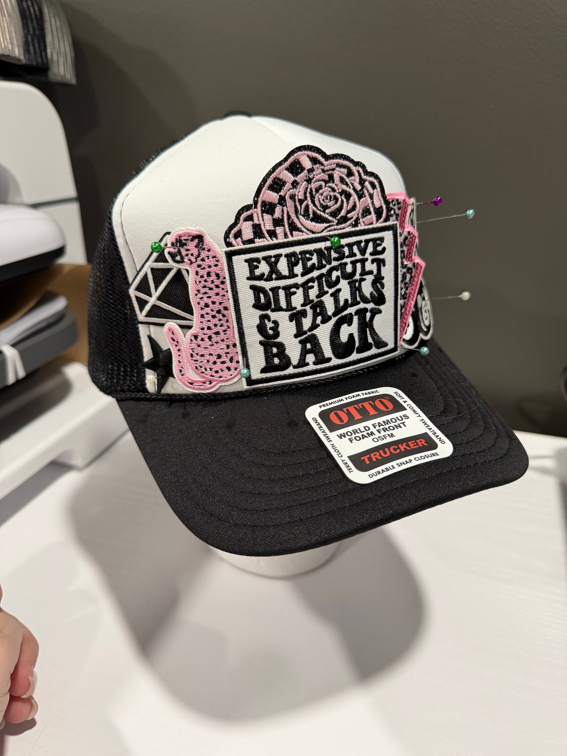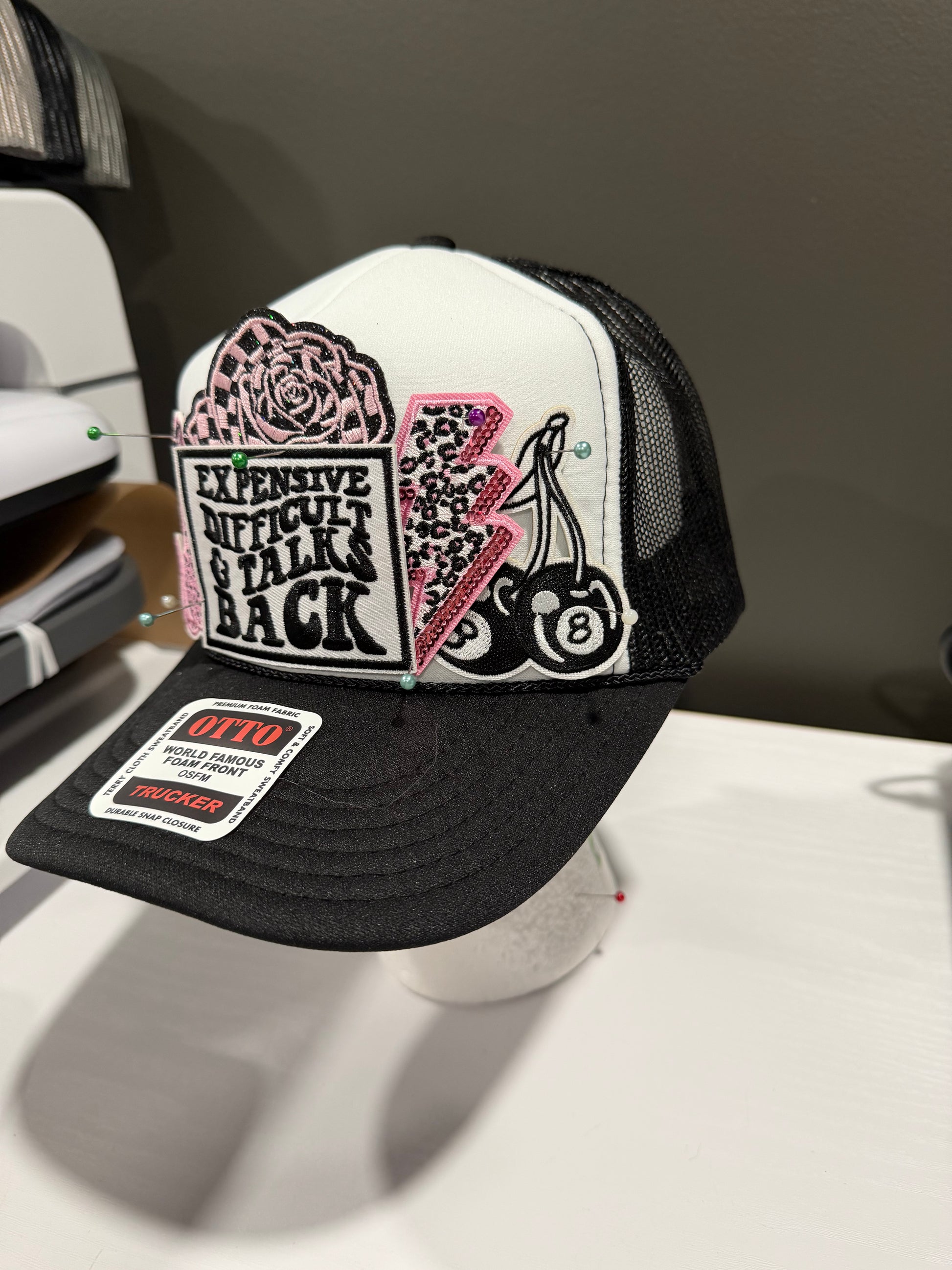 Pink & black theme on black & white Otto hat. As pictured. Ready to ship.
